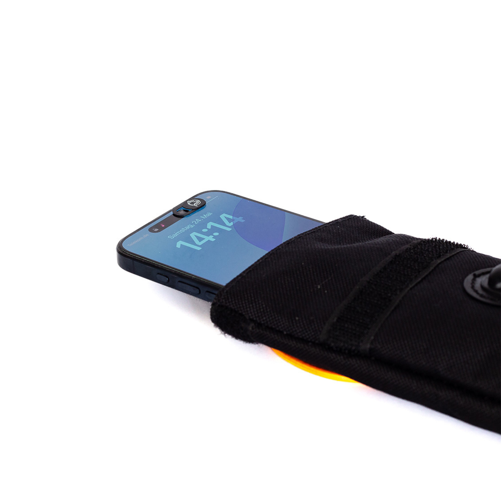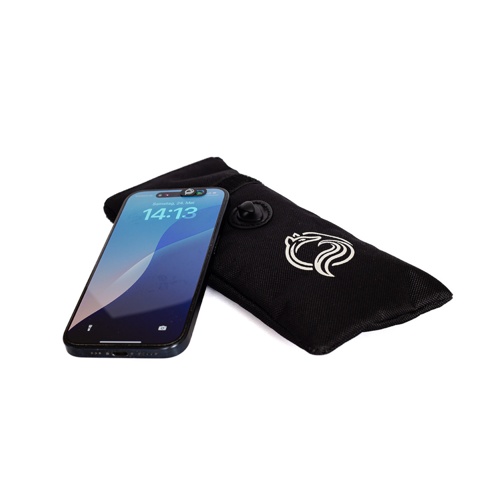 Gerät einlegen, zweifach umklappen, Klettverschluss schließen, Dehnungsband sichern – fertig. Nur bei korrektem Verschluss ist die Signalabschirmung 100 % wirksam.